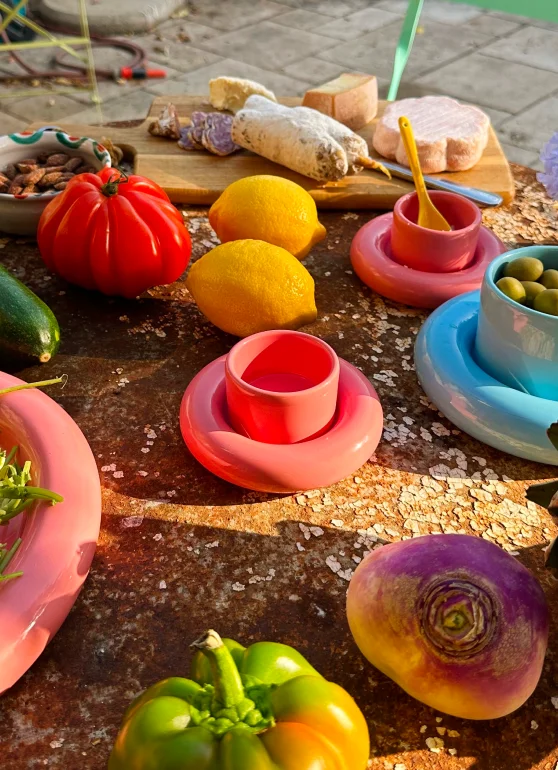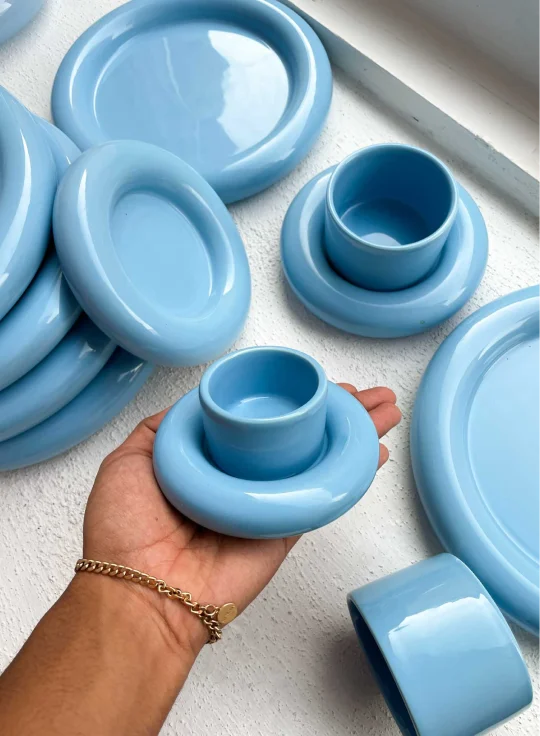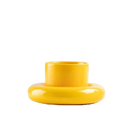 Glazed ceramic chunky cup and saucer. Gustaf Westman logo embossed at base. Each cup is unique and natural color shiftings occur.